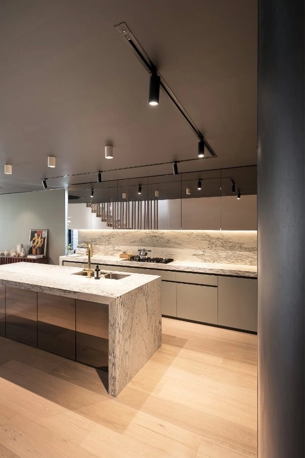Modern home illuminated with track lighting to create clean lines, controlled brightness, and a refined interior aesthetic.